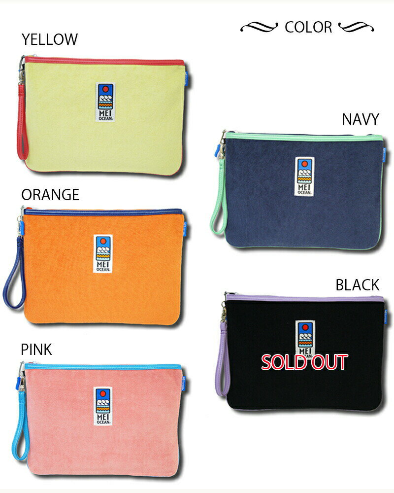 【ブランド】MEI OCEAN 【メーカー品番】R157 【サイズ】22 × 32 cm 【カラー】イエロー(12)、オレンジ(22)、ピンク(43)、ネイビー(61) 【素材】Pyle(パイル) 【仕様】 メイン収納:ファスナー式開閉 内側:ポケット×2 【注意事項】 本製品は、水分、汗、摩擦等により変色・移染する場合がございますのでご了承下さい。