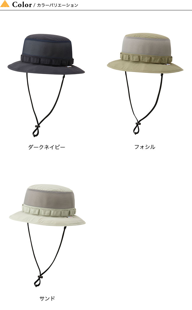 サイドパネルにメッシュを配した風の抜けの良いトレッキングハット。